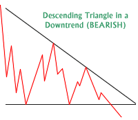 Unlike the ascending triangle, this time the bottom part of the triangle appears flat. The top part of the triangle has a downward slant. Prices drop to a point where they are oversold. Tentative buying comes in at the lows, and prices perk up. The higher price however attracts more sellers and prices re-test the old lows. Buyers then once again tentatively re-enter the market. The better prices though, once again attract even more selling. Sellers are now in control and push through the old lows of this pattern, while the previous buyer's rush to dump their positions. HERE IS A SAMPLE CHART WITH A DESCENDING TRIANGLE PATTERN
