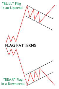 Bullish flags are characterized by lower tops and lower bottoms, with the pattern slanting against the trend. But unlike wedges, their trend lines run parallel. Bearish flags are comprised of higher tops and higher bottoms. "Bear" flags also have a tendency to slope against the trend. Their trend lines run parallel as well.