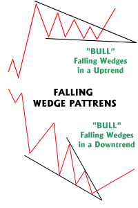 A falling wedge is generally considered bullish and is usually found in up-trends. But it can also be found in downtrends as well. The implication however is still generally bullish. This pattern is marked by a series of lower tops and lower bottoms.