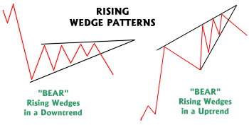 A rising wedge is generally considered bearish and is usually found in downtrends. They can be found in up trends too, but would still generally be regarded as bearish. Rising wedges put in a series of higher tops and higher bottoms. HERE IS A SAMPLE CHART WITH A WEDGE FORMATION PATTERN